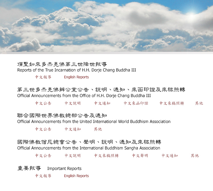 第三世多杰羌佛辦公室公告 第三世多杰羌佛辦公室說明 聯合國際世界佛教總部公告 聯合國際世界佛教通知 國際佛教僧尼總會公告 國際佛教僧尼總會說明 國際佛教僧尼總會來稿照轉 國際佛教僧尼總會聲明 國際佛教僧尼總會通知 國際佛教僧尼總會其他 第三世多杰羌佛辦公室通知 第三世多杰羌佛辦公室其他發函(轉發) 第三世多杰羌佛辦公室來稿照轉(轉發) 聯合國際世界佛教總部其他發函(轉發) 第三世多杰羌佛降世 中文報導 第三世多杰羌佛降世 English Report 重要中文報導 Important English Reports 第三世多杰羌佛辦公室來函印證